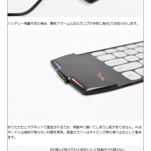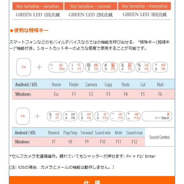 ●LEDランプ: LED1:電源ON(青色)、ペアリング(紫色)/ LED2:バッテリー残量(緑色・赤色)、キー音(赤色1~3点滅)、キー反応感度(緑色1~3点滅)