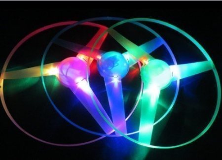 Our Wonderful Spinning Effect Discs: 3 different colors flashlights created lighting effect with high-speed spinning fan and high flying range. Easy Operation: Turn on the LED lights, then pull action cord gradually increasing speed ,so that saucers can fly with flashing. On / Off button under the bottom of the flying saucer. Material: Plastic + LED + electronic components + nylon string Made of durable plastic. Length of hurdle: 4.7" / 12cm Diameter of flying spin: 9.6" / 24.5cm Will make great gift for any occasion.