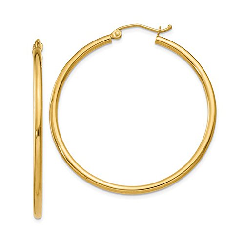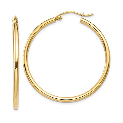 Want a classic yellow gold hoop that has just a little bit more presence? These 1 1/2 inch hoops are the perfect choice. Just the right size, with just the right 2mm tube width, they are a perfect addition to every hoop lover's collection. Their timeless shape will let you wear them anywhere, while their larger size is sure to get you noticed. Light, comfortable, and easy to wear, these hoops will be the best choice you've made yet! Each pair of hoop earrings comes gift wrapped in an attractive package. These hoops are 14k yellow gold. They are NOT plated, but have a pure gold body with a hollow interior. Every hoop comes with an authenticated 14k stamp.Feature