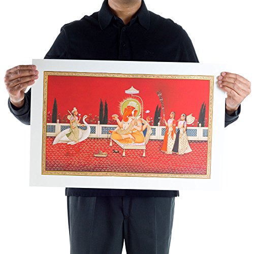 -. Artist : J.R Sharma -. Color : Red, Orange, Yellow, Gold -. Feature : Paper Size (with border) Height 41cmx Width 64cm / Image size Height 33.3cm x Width 56cm / P.R.Inted on premium quality 100% acid-free cotton rag fine art paper using archival pigment inks / P.R.Inted on larger paper with ample border to allow for matting and framing / A signed certificate of authenticity accompanies this Limited Edition P.R.Int -. IsAdultProduct : 0 -. IsAutographed : 0 -. MediaType : Archival Digital -. ProductGroup : Art -. ProductTypeName : FINE_ART_EDITIONED -. Size : Image size Height 33.3cm x Width 56cm -. Title : Traditional Indian Painting of Goddess Saraswati with Ganesh and Consorts on terrace - Fine Art P.R.Int
