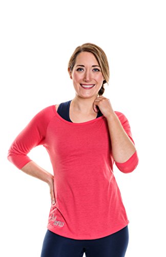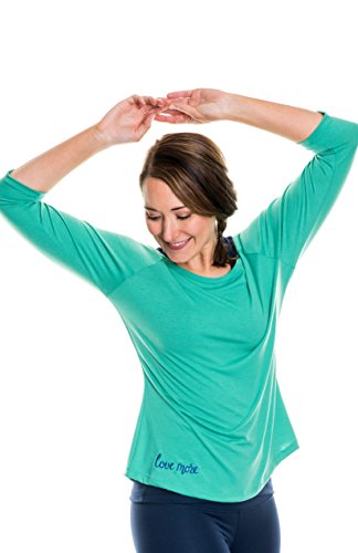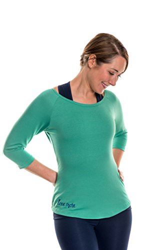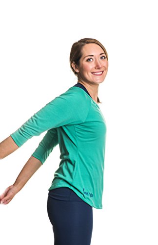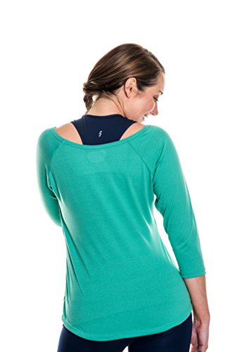 PRODUCT DETAILS: Kelly green scoop neck, 3/4 length tee with cobalt blue embroidery. Designed for yoga, running, pilates, workout, leisure, and weightlighting. Made of an extra-soft, cozy tri-blend fabric in the USA.