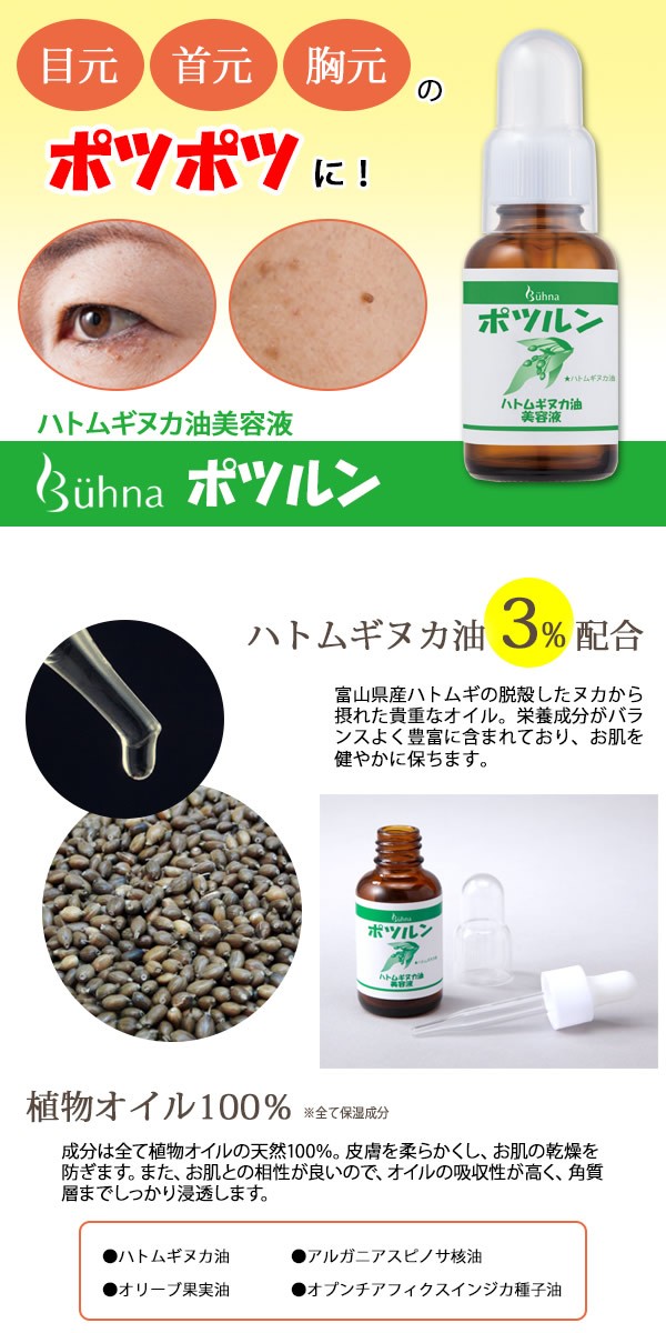 | 富山県産のハトムギの脱穀したヌカから摂れた貴重な「ハトムギヌカ油」とオリーブ果実油、アルガンオイル、サボテンオイル(オプンチアフィクスインジカ種子油)を配合したオイル100%美容液。ハトムギヌカ油には、栄養成分がバランスよく豊富に含まれており、お肌をなめらかにします。美容液/植物オイル/目元/首元/胸元/角質ケア |