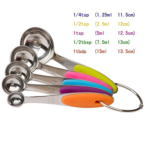 - 5 DIFFERENT SIZES: 1 tbsp/15 mL, 1/2 tbsp/7.5 mL, 1 tsp/5 mL, 1/2 tsp/2.5 mL, 1/4 tsp/1.25 mL.