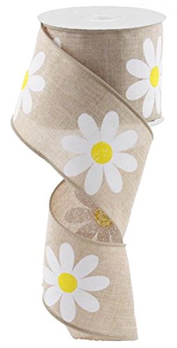 Daisy Flower Canvas Wired Edge Ribbon, 2.5" x 10 Yards (Light Tan)