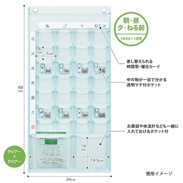 fk094igrjsお薬やサプリメントの飲み忘れ防止に大活躍1週間分をしっかり管理できる便利な投薬ポケットです サイズ W34×H68cm(ポケットマチ3cm) 個装サイズ:29×35×5cm 重量 個装重量:280g 素材・材質 PVC(塩ビ)、プラスチックハトメ、上質紙 製造国 日本 1週間のお薬やサプリメントを管理できる便利なお薬ポケット ※モニターの設定などにより、実際の商品と色味や素材の見え方が異なる場合がございますあらかじめご了承ください お薬やサプリメントの飲み忘れ防止に大活躍1週間分をしっかり管理できる便利な投薬ポケットです