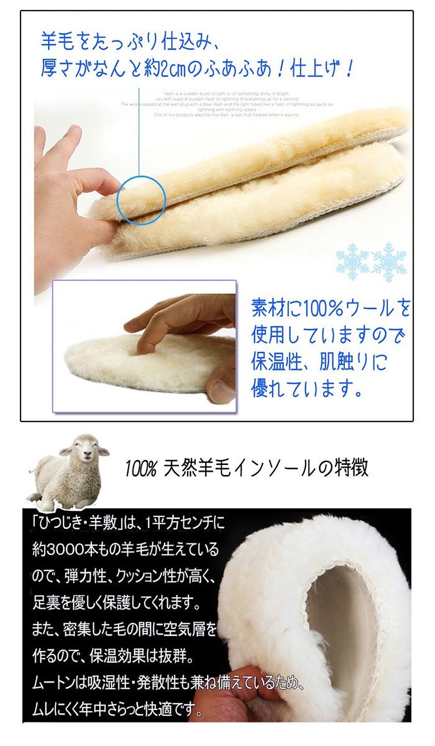 ★ "Sheets and sheepskin" has about 3000 wool in 1 square centimeter, so it has high elasticity and cushioning properties and protects your feet gently.