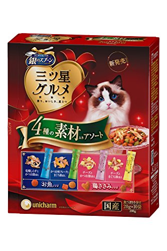 原材料:穀類(トウモロコシ、小麦粉、コーングルテンミール、パン粉)、肉類(ポークミール、チキンミール、ビーフミール、チキンエキス、ササミパウダー)、油脂類、魚介類(フィッシュエキス、フィッシュミール、鰹節、鮪節、乾燥シラス、カツオミール、マグロミール、煮干パウダー、白身魚ミール)、ビール酵母、酵母エキス、チーズ、カツオ風味焼カマボコ、野菜類(ニンジンパウダー、カボチャパウダー、ホウレンソウパウダー)、ミネラル類(カルシウム、塩素、コバルト、銅、鉄、ヨウ素、カリウム、マンガン、リン、亜鉛)、調味料、ビタミン類(A、B1、B2、B6、B12、C、D、E、K、コリン、ナイアシン、パントテン酸、ビオチン、葉酸)、着色料(二酸化チタン、赤色102号、赤色106号、黄色4号、黄色5号、青色1号)、アミノ酸類(タウリン)、酸化防止剤(ミックストコフェロール、ハーブエキス)
