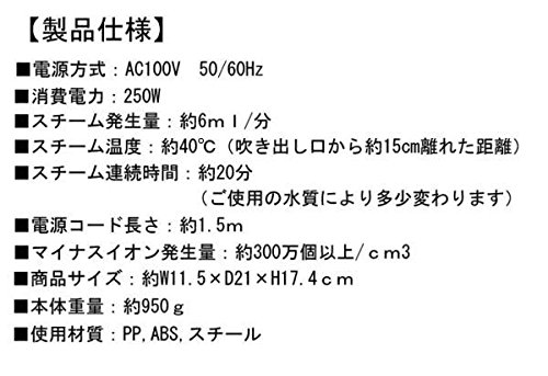 스팀발생량:약6ml/분. 스팀연속 시간:약20분(사용 수질에 의해 다소 변합니다)