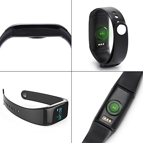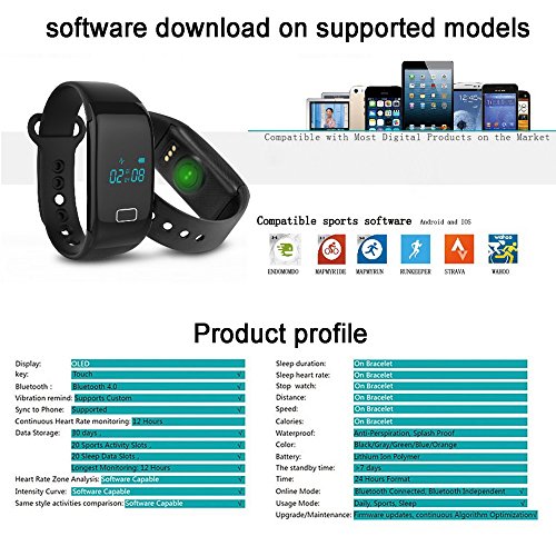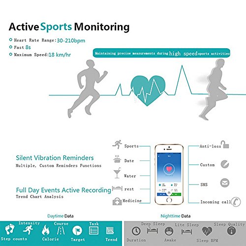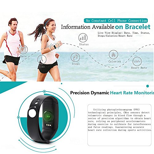 -. Feature : No need to carry a cell phone any more when you at sporting, this wristband can display and storage date, time, heart rate, step and calorie counter informations alone / Inbuilt high precision heart rate sensor, accurately recording your heart rate / Supports various sports record management: walking, running, cycling and climbing etc / Bluetooth 4.0, fits above iOS 7 and Android 4.3 version / Mute vibration alarm will wake you up and won't disturb others in the morning