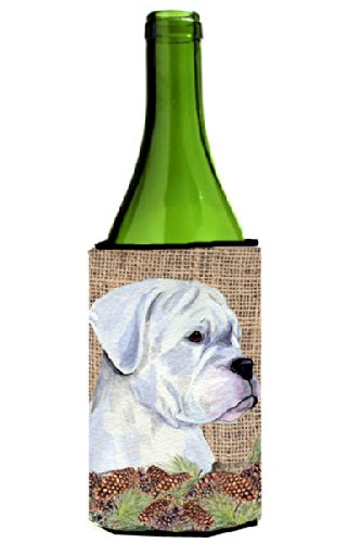 White Boxer on Faux Burlap with Pine Cones Wine Bottle Beverage Insulator Beverage Insulator Hugger