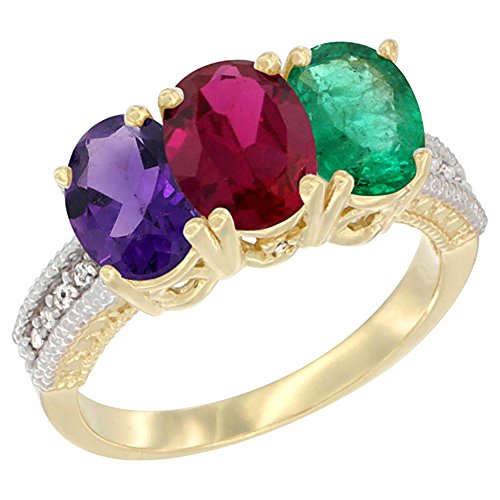 -. Title : 14K Yellow Gold Natural Amethyst, Enhanced Ruby & Natural Emerald Ring 3-Stone 7x5 mm Oval Diamond Accent, sizes 5 - 10