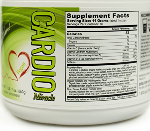 Cardio Miracle(TM) Vegan has been formulated using organic, naturally occurring source ingredients. The flavor is a neutral, complementary flavor so it will mix well in a greens drink, juices or other non-protein drinks Cardio Miracle (TM) is a scientifically formulated, ratio balanced, Heart Healthy drink that contains L-Arginine AKG, L-Citrulline, Ornithine, Vitamin D, Antioxidants and so much more!