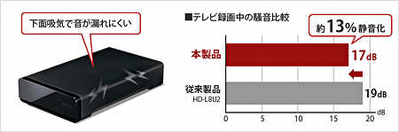 ???前面吸気方式だった従来製品に比べ、約13%の静音化を実現しました。テレビを視聴しながらの録画や寝室での使用など、音の発生に対して敏感になる場所や状況に最適です。