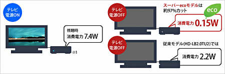 ???本製品はテレビなどの家電製品と接続した場合の電源連動OFF時に無駄に流れていた電気をカットし、欧州の厳しい待機電力基準をクリアした「スーパーeco」機能を搭載。