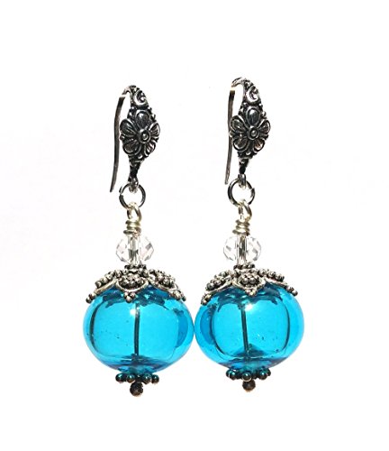 -. Title : 1 Pair of Capri Blue Hollow Bead Earrings Transparent Glass Bubble Lampwork with Sterling Silver
