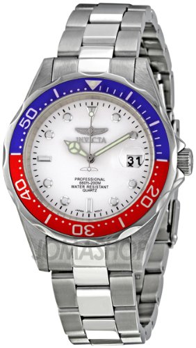 With the affordable silver-tone Invicta Pro Diver SQ quartz men's watch, you can still afford to buy flippers and a pair of goggles. It features a shock-resistant, Japanese quartz movement that will stand up to the rigors of your undersea adventures, and it's water resistant to 200 meters (660 feet). It's topped by a red and blue-plated unidirectional rotating bezel with elapsed time markings in silver and scalloped edges for a firm grip even with diving gloves. The white dial includes large Tritnite luminous markers and hands (with seconds hand) and a date window at 3 o'clock with a magnifier. Other features include a diver's buckle with safety clasp and an anti-reflective mineral crystal.Pro Diver Collection