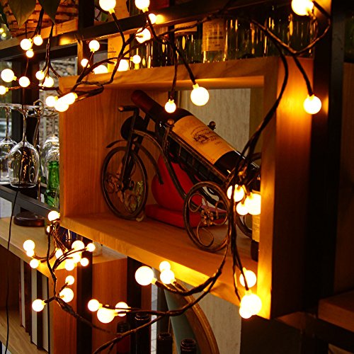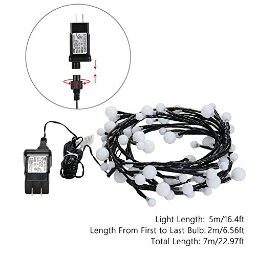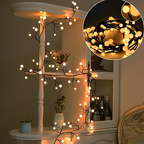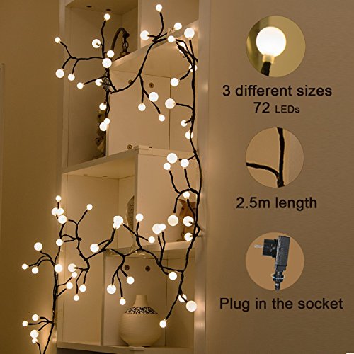 - [CREATIVE DESIGN]: 72 energy-saving light bulbs, divided into 24 groups, each group has three bulbs (0.95in/0.75in/0.55in), the effect is vineyard-like and resembles grapes on a vine. Bulbs are non fragile plastic, cord is made of flexible copper wires. 8.2ft long string, 16.4ft lead cord length, a lot of freedom to place in different patterns!