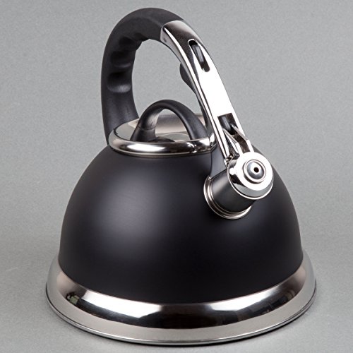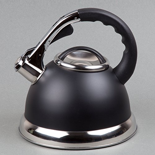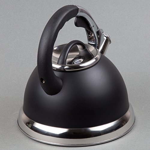 Creative home camille 3.0 quart opaque black stainless steel tea kettle. heavy gauge aluminum capsulated bottom allows for even heat distribution. polish stainless steel accents on the bottom and lid. stay cool handle with a one touch feature for pouring. whistling spout notifies you when water is boiling.Feature