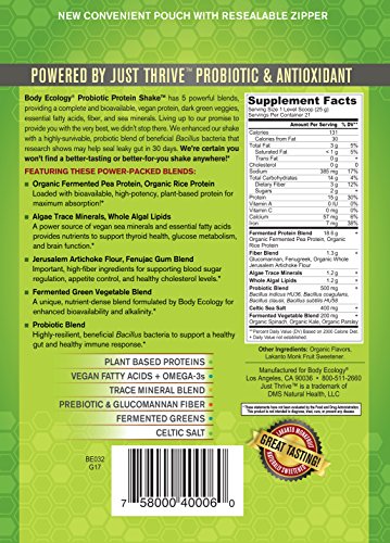 ORGANIC, GLUTEN FREE, DAIRY FREE, SOY FREE, VEGAN, NON-GMO. Protein and probiotics in this tasty shake because your body deserves the best of both worlds from one convenient source. Support and encourage muscle growth. Promote higher energy levels. Support healthier organs, skin, and hair. Helps heal leaky gut.Feature