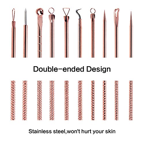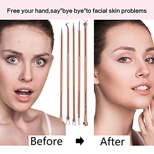 -. Feature : 5 In 1 blackhead remover tools: easy to use, targeted on removing different sized and hard-to-reach impurities such as blemishes, blackheads, whiteheads and pimples, etc. / Color design: this unique color blackhead extractors are the good choice for you to use or as a gift to the one you love / Non-slip handle: anti-slip handles help you better control the pressure during use, ensuring every step can be done accurately to avoid damage to the skin / Double-head tools: each tool has 2 different heads, they are good for removing different facial impurities, use them to clean your face effectively / Good quality material: made with anti-microbial stainless steel, safe and won't hurt your skin; They are sturdy and not easy to bend