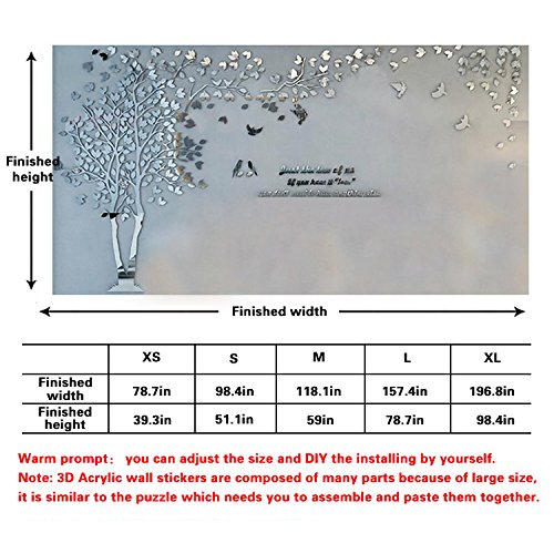 -. Feature : Note: the pictures displayed are for showing purposes only, the large size is in order to show all details of the product, not reflect the real size, please measure your wall to choose the most suitable size / As different computers display colors differently, the color of the actual item may vary slightly from the above images / Please be patient to DIY, there are so many piece and you have to stick them one by one, it is good idea to ask someone help you / Acrylic material,the thickness is 2mm. It can be stuck to any smooth surfaces such as walls, mirrors and windows / Back is self-adhesive, don't need extra glue. This acrylic wall sticker is a great idea to be decoration for living room, dinning room, bedroom, TV wall background, sofa backdrop, corridor, also can be served as artistic decoration