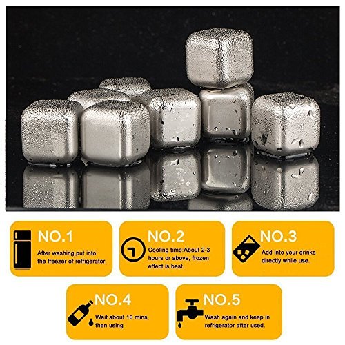Studio : Mayshion Publisher : Mayshion Product Description Notes: Never let these cubes go into your mouth or try to swallow and eat them; keep them away from your kids! About the product : High Quality, thick stainless steel material chilling stones Contain a food grade chilling gel in the center, allowing for longer cooling time, they're not only to chill a warm drink, but also to hold the temperature of an already chilled drink, over any other type on the market. Designed to be reusable--with durable and high quality stainless steel material. The biggest advantage to use our stainless steel reusable stainless steel ice cubes is to have your drink not diluted by the traditional ice cubes, and extend extra chilling. How To Use: 1.Please wash stones before first use. 2.Place stones in freezer for 4 hours or more. 3.When ready, add 3-4 frozen cubes per drink and enjoy. 3.To clean--only rinse with warm water and air dry. Package List: - Stainless Steel Chilling Cube*1 - Storage Box*1 - Tongs*1
