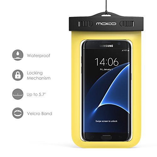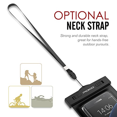 MoKo universal waterproof case with armband and neck strap for Apple iPhone 6, 6 Plus, 5S 5C 5 4S, Samsung Galaxy S6, S6 Edge, S6 Active, S5, S4, S3, Note 4 / 3 / 2 / 1, HTC One M9, M8, M7, Max, LG, G4, G3, G2, Nexus 6, 5, 4, Sony Xperia Z4, Z3, Z2, Nokia Lumia, BlackBerry, Motorola Droid Turbo, MOTO G, X, E - Also fits other Smartphone, iTouch, MP3 player, - IPX8 Certified, Black. Synchronously allowing for containing mobile phone wit. TPU casing with a simple snap and lock seal on top safeguard against water, snow, dust and dirt. Lightweight with a lanyard for hanging around neck or to be attached to arm. IPX8 Certified to 98 feet (30 meters).