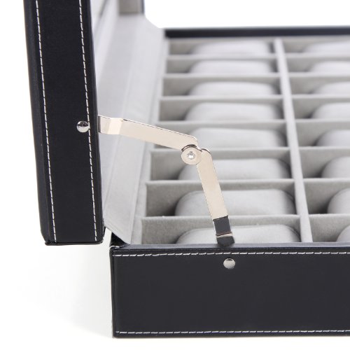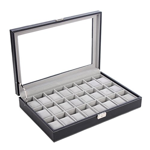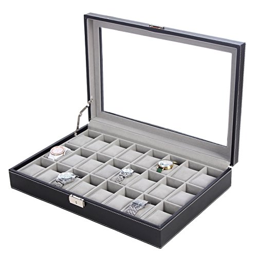 -. Feature : TOP-NOTCH CRAFT -- Made of quality black faux leather and soft gray velvet, this watch box is superexcellent to protect your beloved watches from scratch and damage / 24 SLOTS WATCH DISPLAY CASE -- enough space with 24 removable velvet pillows, wonderful gift choice and home jewelry decoration / LARGE REAL GLASS LID -- Real glass lid keeps your watches from dust, and offers you an open view of the displayed watches / METAL HINGE & LOCK -- The lid has a metal hinge attached to keep it from falling back. Metal lock with keys makes sure of safety / MULTI-FUNCTIONAL COMPARTMENT -- Suit for watches, hairpin, cuff links, brooches, and other stuff