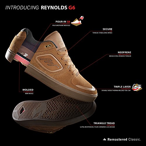 Studio : Emerica Publisher : Emerica Binding : Apparel Product Description Inspired by the iconic pro models of Andrew's past, the Reynolds G6 is not only a hybrid, which combines the design cues from the Reynolds 1 and 2, but also features new technology, modernizing this style into a category of its own. The new Reynolds G6 is a true cup sole with a "pour-in" G-6 poly-urethane midsole. This means the foam is poured into the cup sole in its uncompressed liquid state to stimulate better bonding and flexibility to the bottom of the shoe. This gives you the flexibility and board feel of a vulc, with the support and cushioning of a cup sole. The toecap features a double-sided layer of hot melt that bonds panels together, preventing blowouts and extending the life of the shoes. The tongue of the Reynolds G6 embodies "fit system" lycra spandex stabilizers, as well as perforated neoprene for breathability. All made up to Andrew's standards. 100% backed by the boss 0