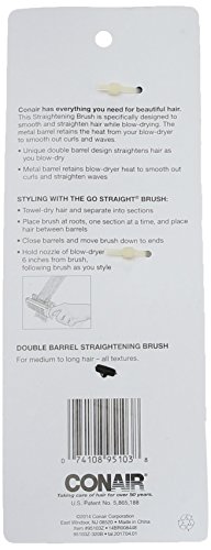 -. Binding : Health and Beauty -. Brand : Conair -. EAN : 0074108951038 -. Feature : Can help you get straight hair in minutes / Innovative double-barrel design works on straightening your hair while you blow-dry / For use after shampooing / Quality construction, designed by the experts at Conair / Please read all label information on delivery -. Label : CONAIR -. Manufacturer : CONAIR -. Model : 95103 -. MPN : 95103 -. NumberOfItems : 1 -. PackageQuantity : 1 -. PartNumber : 95103 -. ProductGroup : Beauty -. ProductTypeName : BEAUTY -. Publisher : CONAIR -. Studio : CONAIR -. Title : Conair 91503 Go Straight Hair Brush (Colors May Vary) -. UPC : 074108951038