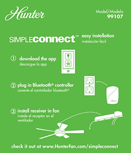 Hunter SIMPLEconnect is a programmable control that uses Bluetooth technology so you are able to control your ceiling fan with your cell phone. SIMPLEconnect works with all major brand ceiling fans with pull chains. With the scheduling function you are able to program you fan and go hands-free. With the sleep timer you are able to schedule your fan or fans to shut down shortly after you do. SIMPLEconnect also has a security feature that will turn your fan lights on randomly while you are away to help keep intruders away. Installation is easy. 1-Download the app. 2-Plug in the Bluetooth controller into a wall outlet. 3-Install the receiver in the canopy of the ceiling fan. The Bluetooth receiver has up to an 80ft range. SIMPLEconnect also has an on/off remote control. Phone compatibility - iOS 7.1 or higher, Android 4.3 or higher. Receiver dimensions, 4.5-inches x 2.5-inches x 1-inch. One year limited warranty. The app is available for download from the Apple App Store or Google Play.Feature