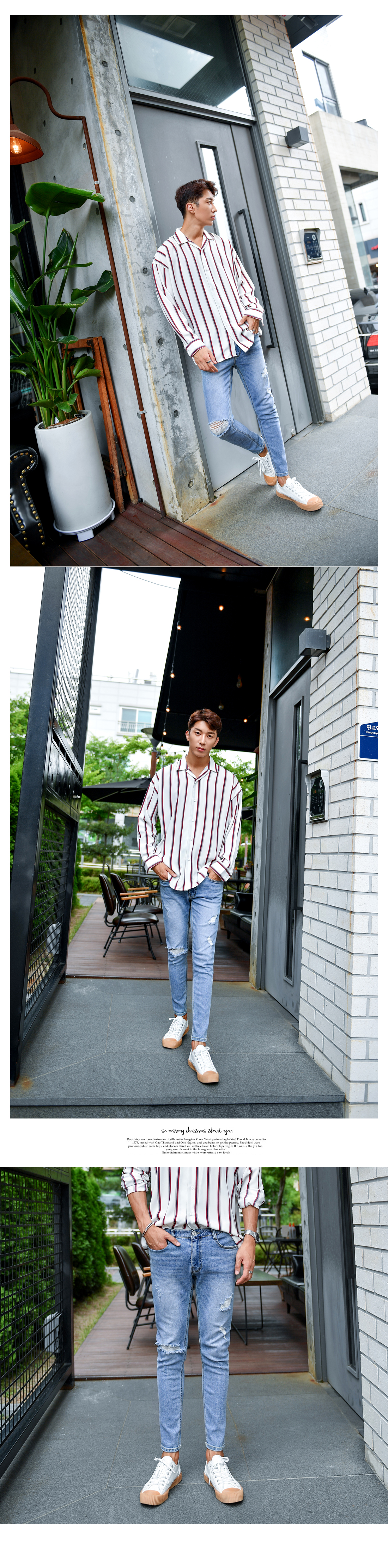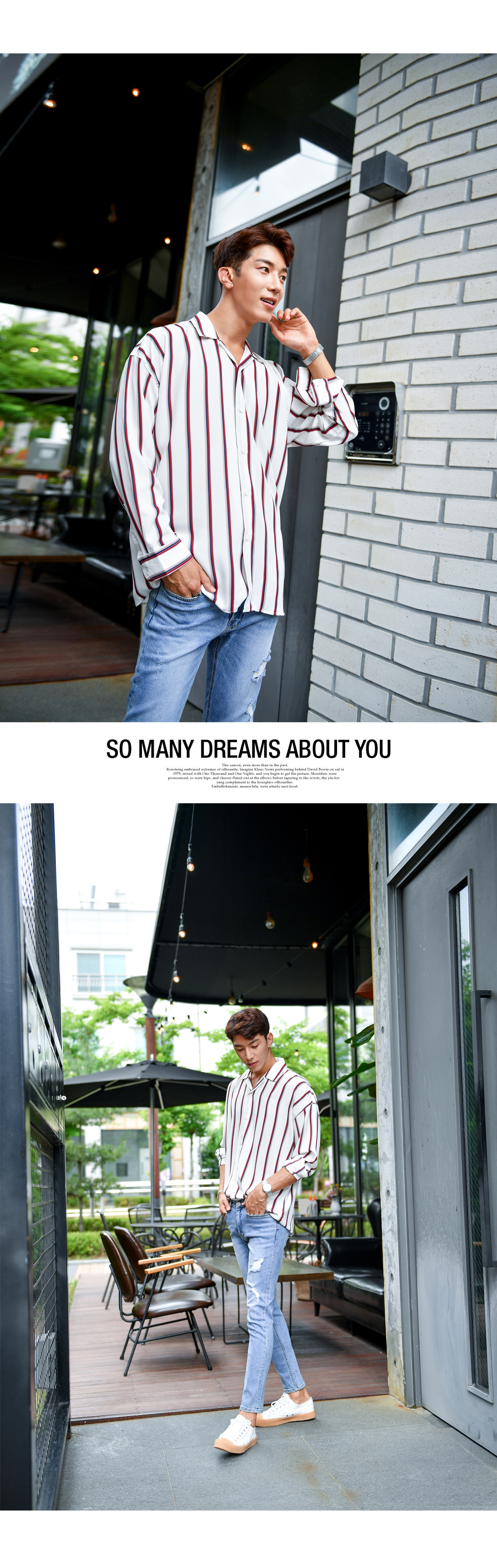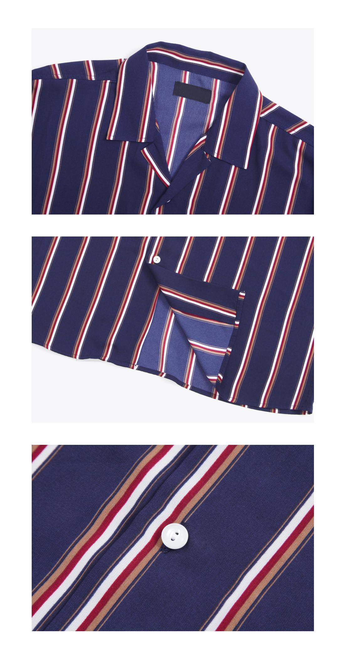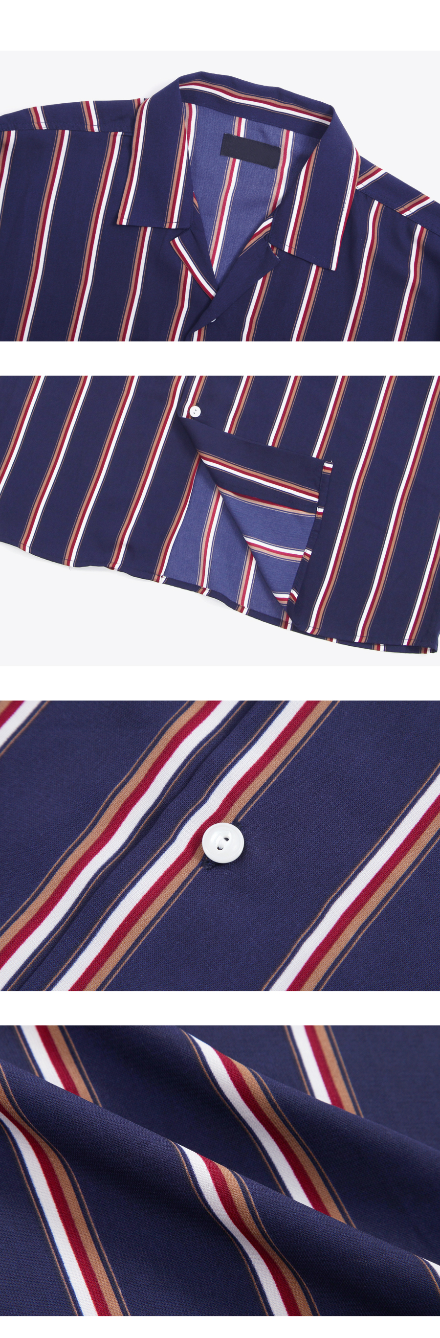 -찰랑한 소재감이 매력적인 오픈카라 스트라이프 셔츠입니다