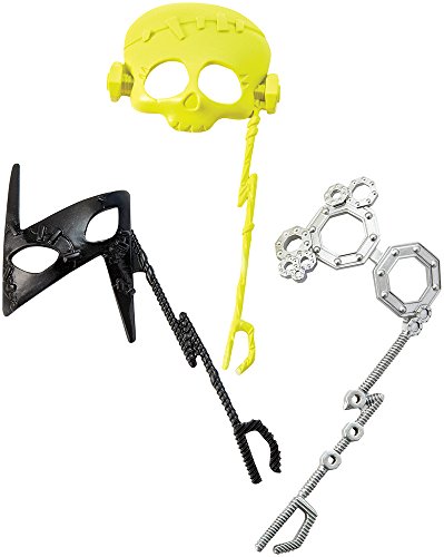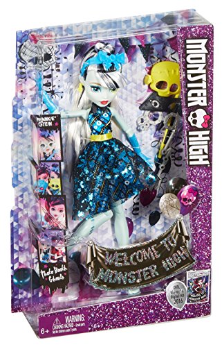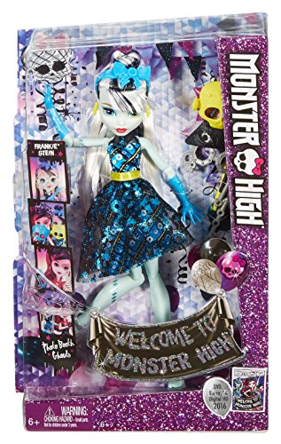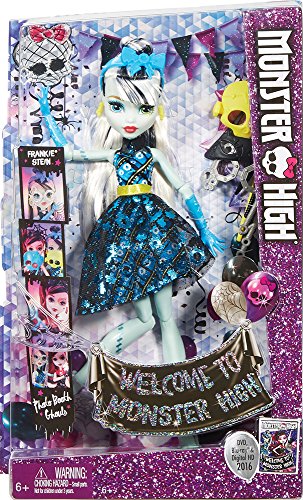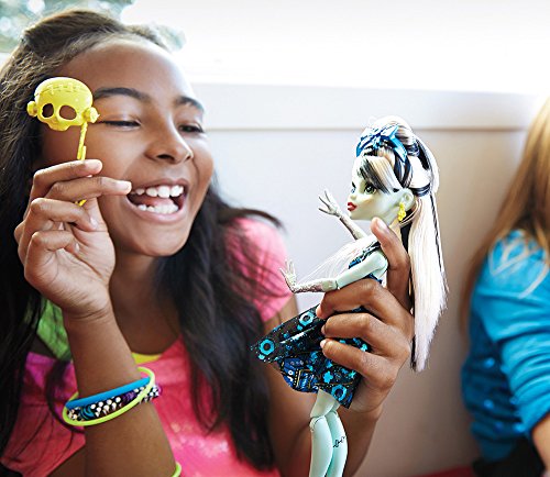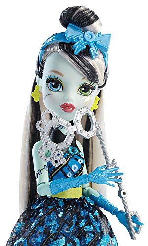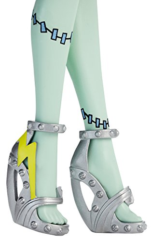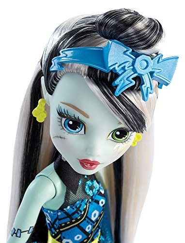 In the new Monster High story “Dance the Fright Away,” the students of Monster High unite to revel in the opening of the iconic high school, and the ghouls are wearing their beast for the celebration! Frankie Stein doll is flawesome in a party dress with metallic details, fancy shimmer and glam ghoul makeup. Three photo boo-th accessories mean lots of photo ops. Frankie Stein doll, daughter of Frankenstein, is voltageous in her signature plaid in lightning bright metallic, bolt-detailed heels, lightning-themed makeup and three props for photo boo-th fun that include a lightning bolt.Feature