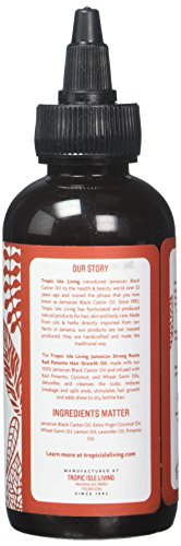 The Tropic Isle Living Jamaican Strong Roots Red Pimento Hair Growth Oil with the Jamaican Black Castor Oil, infused with the red pimento, coconut & wheat germ oils, detoxify and cleanses the scalp, reduces breakage & spilt ends, stimulate rapid hair growth & and adds volume & shine to dull, dry brittle hair. No Artificial Fragrances No Parabens No Petroleum No Sulfates No Synthetic Dyes Ingredients Jamaican Red Pimento Oil, Jamaican Black Castor Oil, Coconut Oil & Wheat Germ Oil Includes Manufacturer's Warranty (Item does not have a seal under the cover or on top on the cover. The item has a screw-top to release.)Feature