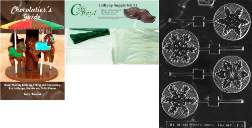 Cybrtrayd Assorted Snowflakes Lolly Chocolate Mold with Chocolatier's Bundle of 25 Lollipop Sticks, 25 Cello Bags, 25 Green Twist Ties and Chocolatier's Guide