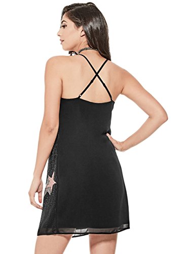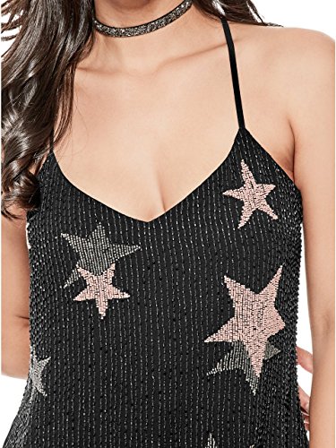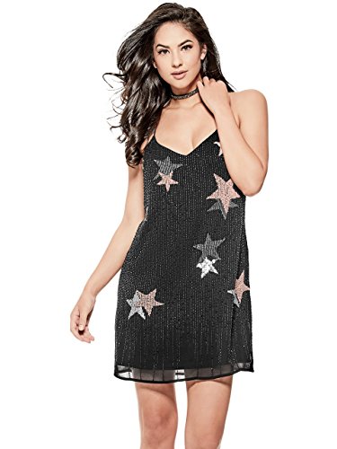 Sleeveless dress features beaded chiffon overlay with metallic star design. Adjustable straps.