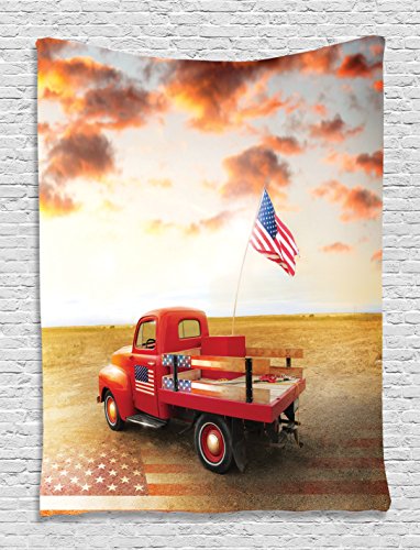 Red Truck Husband Gifts Vintage Funny Cars American USA Flag 1950s Retro Wall Hanging Decor Art Pictures Bedroom Living Room Decoration for Man Cave Accessories Tapestry, Red Brown Mustard White