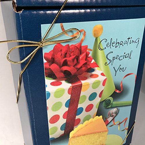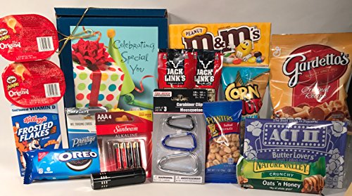 -. Feature : Be sure to check "THIS ORDER CONTAINS A GIFT" so that you can write a FREE message / Friend, Dad, Uncle, Cousin, Brother, Grandpa having a birthday soon? Send this gift box to brighten their day! / 16 Items in Each Box -- Including 2 Jack Link Beef Steaks, 3.10 oz Peanut M&M's , 2 P.R.Ingles Original (.67 oz each), Package of 3 Carabiner Clips (Assorted Colors), and an LED Flashlight (Assorted Colors) / Also includes: Sunbeam Pack of 4 AAA Alkaline Batteries (For the Flashlight), 1.7 oz. Ranch Corn Nuts, Nature Valley Crunchy Oats 'N Honey Granola Bars, Act II Butter Lovers Microwave Popcorn, 1.75 oz Gardetto's, 1 oz. Planters Peanuts, 2 oz. Oreos, 1.2 oz Frosted Flakes, and a Package of Prestige 2016 NFL Trading Cards (10 Cards) / All packed in a glossy, sturdy gift box (no cheap basket or flimsy cellophane) with the message "Celebrating Special You" on front, tied with a gold bow