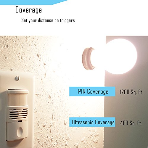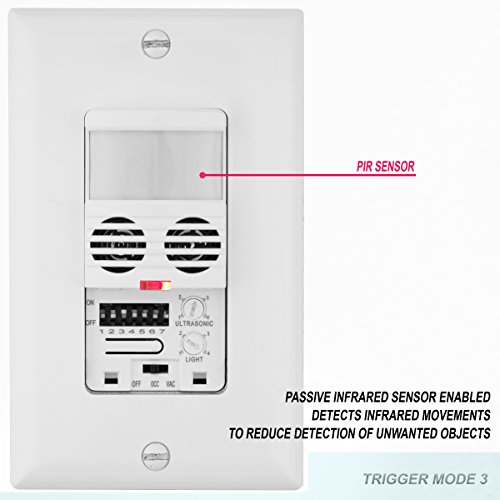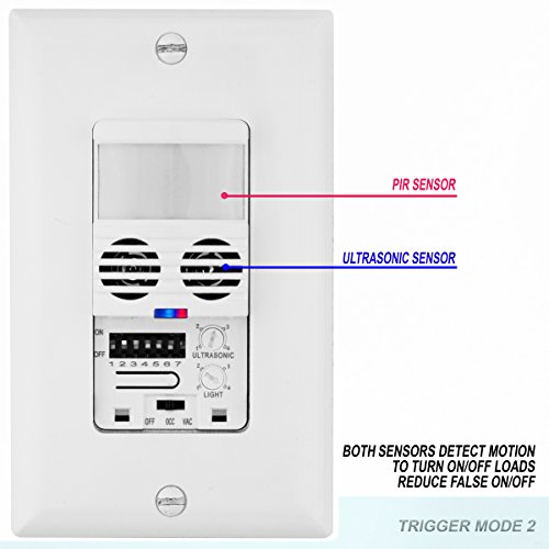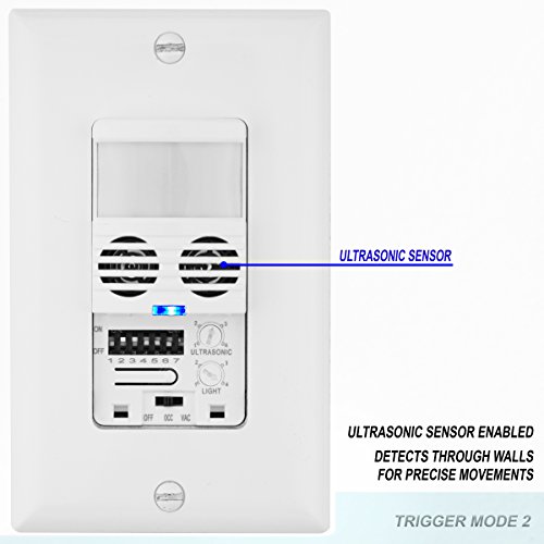 -. Feature : Detects very fine motion, enhanced accurancy with Integrated PIR and Ultrasonic sensor technology in one sensor switch / Allows to set triggering when both technologies detect motion, when only PIR or ultrasound sensor detects motion / Eliminates false triggering, fast ON/OFF; Ideal for home, closet, garage, hotels, conference rooms and offices / Adjustable timeout from 15 seconds to 30 minutes;Walk-Through mode: 3 minutes if no activity after first 30 seconds / Coverage:PIR 1200sq ft, 800W incandescent, CFL, LED lighting & motors;UL listed; 5-year warranty