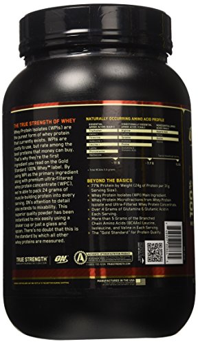 -. Binding : Health and Beauty -. Brand : Optimum Nutrition -. EAN : 0885260299018 -. Feature : THE TRUE STRENGTH OF WHEYWhey Protein Isolates (WPIs) are the purest form of whey protein that currently exists / Optimum Nutrition -. IsAdultProduct : 0 -. Label : Optimum Nutrition -. LegalDisclaimer : Allergen Information: This product contains whey derived from dairy, wheat, and lecithin (to improve mixability) derived from soybeans.Keep out of reach of children. Do not use as a sole sources of nutrition for weight loss or maintenance. -. Manufacturer : Optimum Nutrition -. MPN : 748927028645 -. NumberOfItems : 1 -. PackageQuantity : 1 -. PartNumber : 748927028645 -. ProductGroup : Health and Beauty -. ProductTypeName : HEALTH_PERSONAL_CARE -. Publisher : Optimum Nutrition -. Size : 2 -. Studio : Optimum Nutrition -. Title : Optimum Nutrition Gold Standard 100% Whey Delicious Strawberry -- 2 lbs -. UPC : 748927028645