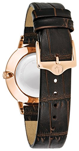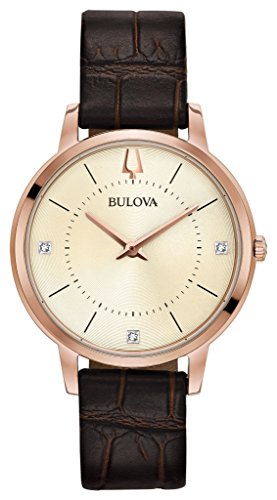 Genuine diamonds accent the face of this brilliant rose goldtone watch from Bulova. The embossed leather strap completes the look.