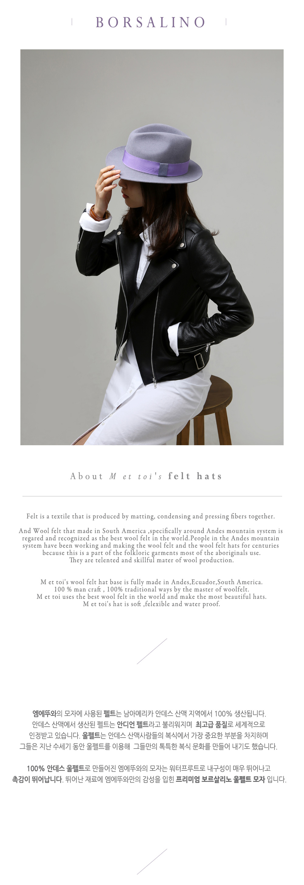 | 엠에뚜와의 모자에 사용된 펠트는 남아메리카 안데스 산맥 지역에서 100% 생산됩니다. 안데스 산맥에서 생산된 펠트는 안디언 펠트라고 불리워지며 최고급 품질로 세계적으로 인정받고있습니다. 울펠트는 안데스 산맥사람들의 복식에서 가장 중요한 부분을 차지하며 그들은 지난 수세기 동안 울펠트를 이용해 그들만의 톡특한 복식 문화를 만들어 내기도 했습니다. 100% 안데스 울펠트로 만들어진 엠에뚜와의 모자는 워터프루트로 내구성이 매우 뛰어나고 촉감이 뛰어납니다. 뛰어난 재료에 엠에뚜와만의 감성을 입힌 프리미엄 보르살리노 울펠트 모자 입니다. |
