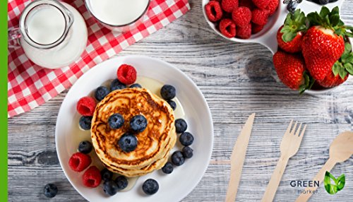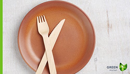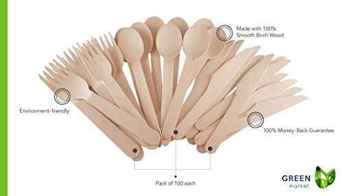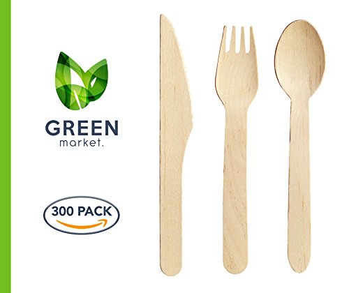 Disposable Wooden Cutlery 300pc set by Green Market, All Natural, Compostable & Eco Friendly Utensils – 100 forks, 100 spoons, 100 knives, 6” Length (Pack of 300). Perfect for party, weddings, picnic.