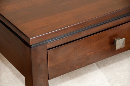 - Feature : Solid Wood Construction / Coffee stain finish with protective NC lacquer / 2 Functional drawers with metal drawer glides / Square bronzed knobs with peaked top / Elegant square tapered legs and floating table top