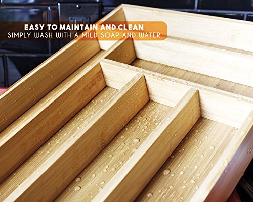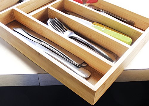 Bamboo Wood Utensil Cutlery Drawer Organizer Tray - 6 Compartments - Store Forks, Knives, Spoons, Flatwear - 14.5X10.25X1.75 inches