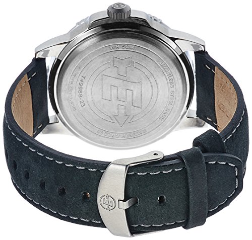 -. Feature : Silver-tone watch featuring black sunray dial with logo, raised degrees and compass points on bezel, and logo-debossed band / Quartz movement with analog display / Protective mineral crystal dial window / Features buckle closure, Indiglo night-light, red arrow-shape second hand, and date window at 4 o'clock / Water-resistant to 50m (165 ft)