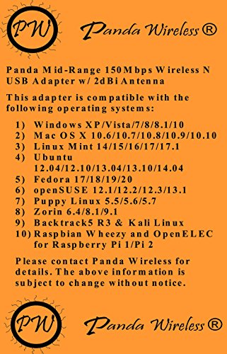 Panda Mid Range 150Mbps Wireless N USB Adapter w/ 2dBi Antenna - Windows XP/Vista/7/8/10, Mac, Mint, Ubuntu, Fedora, openSUSE, Zorin, Lubuntu, BackTrack5 R3, Kali Linux, Raspberry Pi/Pi 2