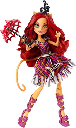 The Monster High ghouls know how to embrace their freaky flaws. And when they have to rally to save the school dance, they decide to focus on those freaky flaws as a fabulous theme. The ultimate skel-ebration of monster mania, the Freak du Chic dance will be the monster bash to end all bashes. The ghouls will be dressed in over-the-top circus-inspired fashions. Toralei, daughter of a Werecat, tops the night as a tightrope walker with a spiderweb umbrella (adorned with cats ears) to help keep her balance for a purr-fect performance. She grabs the spotlight in a furrific dress with colorful print, gray collar belt and shredded hem. Tall pink boots and a performer headpiece are the cats meow. Kids will love recreating favorite scenes or creating a new show of their own. Toralei doll also comes with a doll stand and a mini Freak du Chic poster. Collect her fellow Freak du Chic ghouls (each sold separately) for a full circus! Includes Toralei doll wearing fashion and accessories, umbrella, doll stand and mini Freak du Chic poster. Doll cannot stand alone. Colors and decorations may vary.
