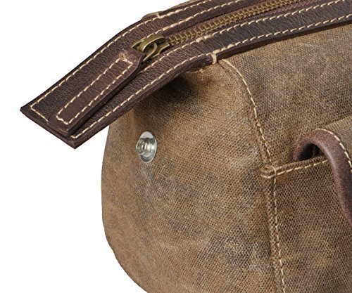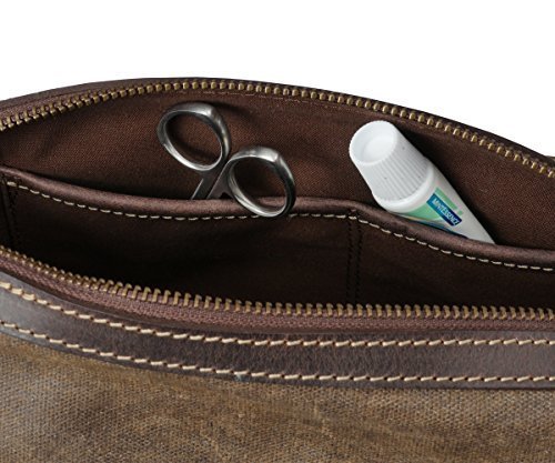 VINTAGE LOOK: Dark brown accents add retro style; saddle-brown bag has a mottled appearance that develops more variations and lines with use, for a rugged masculine look in our canvas toiletry bag for men dopp kit.