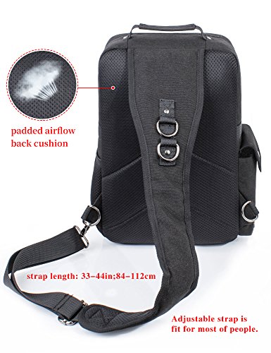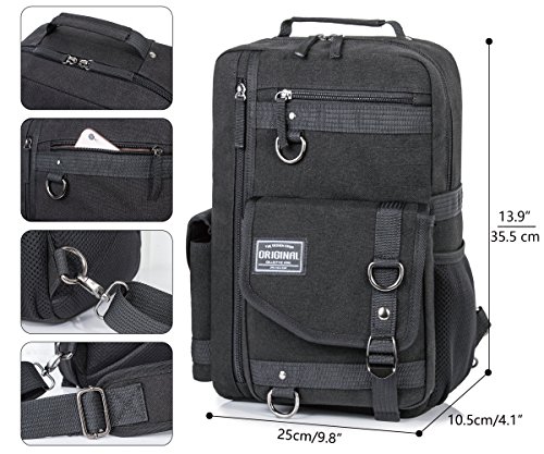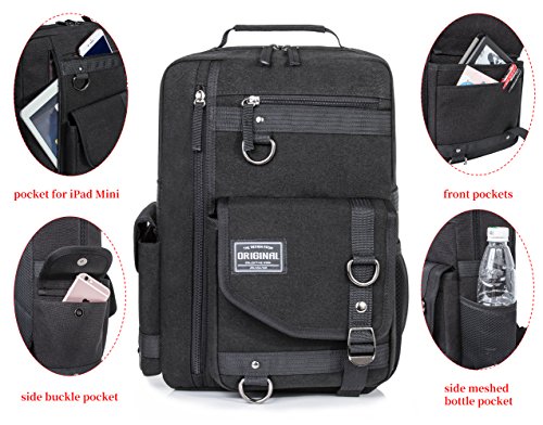 - MULITI-POCKET: This sling bag is padded up for 13in laptop; The main compartment can put books, magazines, laptop, pencil case and other stuffs. There are 1 front small zipper pocket, 1 zipper pocket for iPad Mini, 2 pockets for other daily necessities. The side pockets is perfect size for bottle and chewing gum.